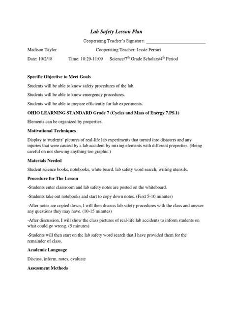 Lab Safety Lesson Plan. Explain the importance of lab safety. An activity worksheet, a practice worksheet, and a homework assignment.