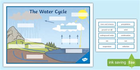 Labelling The Water Cycle. The water cycle is the journey water takes as it moves from the land to the sky and back again. To complete this activity, children will need to use the varying labels.